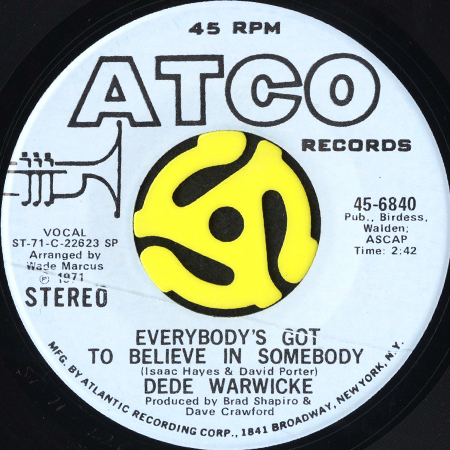 DE DE WARWICKE / EVERYBODY'S GOT TO BELIEVE IN SOMEBODY (45's) (WHITE PROMO) [45-6840]
