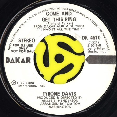 TYRONE DAVIS / COME AND GET THIS RING (45's) (WHITE PROMO) [DK 4510]